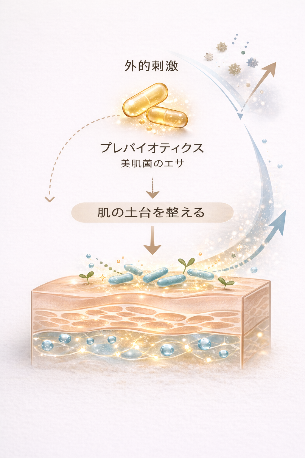 美肌菌を選択的に増やす成分で、肌フローラを整え、うるおいを保ちやすくゆらぎにくい肌環境へ導きます。