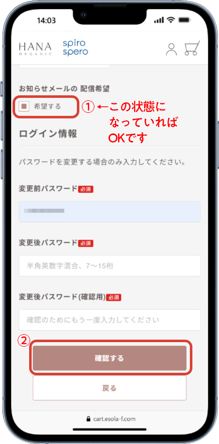 ②「お知らせメールの 配信希望」にチェック>「確認する」ボタンを押すと登録完了です。