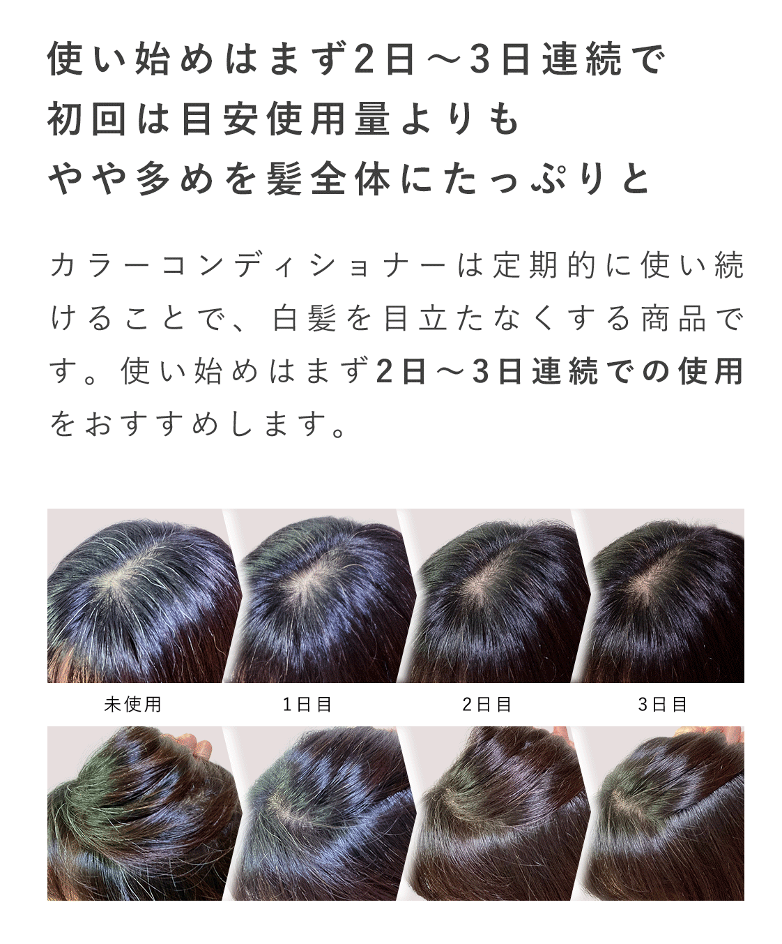 - 最初の3日間から4日間は連続使用。以降は週に1回〜2回のご使用がおすすめです。染毛料にはメイク化粧品にも使われるものと同様の着色剤を使用しています。髪と頭皮に優しい分、何度も重ねることでしっかりと染まる仕様にしています。