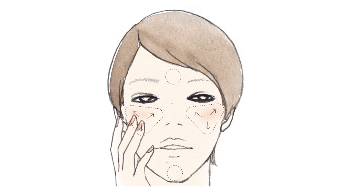 - パフまたは指先に適量をとり、笑った時に頬の高くなる位置を中心に、ぽんぽんとやさしくぼかすようになじませます。